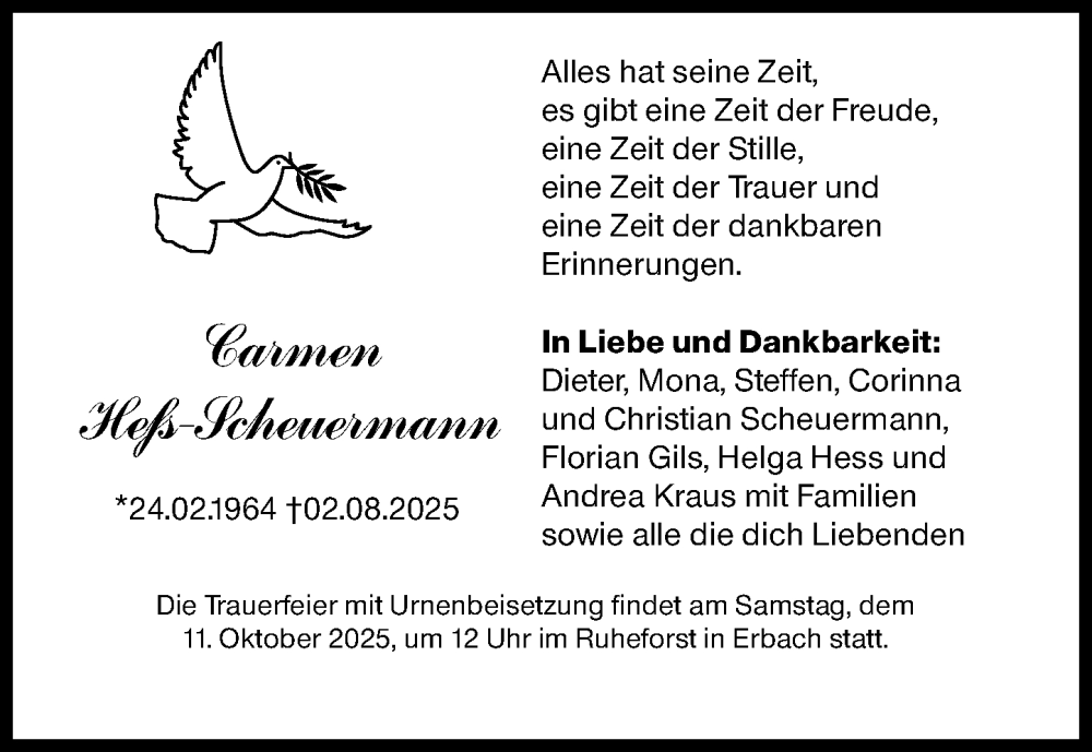 Hier finden Sie alle Traueranzeigen aus der Zeitung, die bisher für Carmen Heß-Scheuermann erschienen sind. Weitere Traueranzeigen, die in der Zeitung erscheinen, werden hier ebenfalls aufgelistet