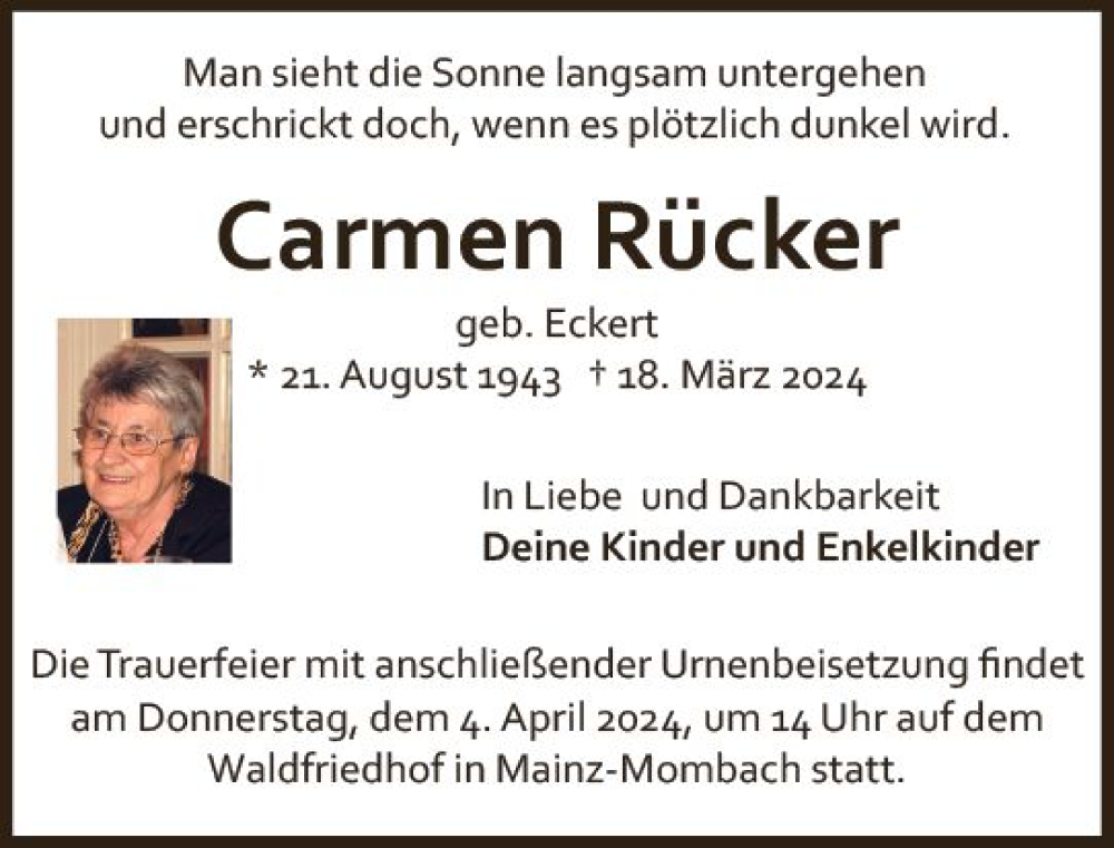 Hier finden Sie alle Traueranzeigen aus der Zeitung, die bisher für Carmen Rücker erschienen sind. Weitere Traueranzeigen, die in der Zeitung erscheinen, werden hier ebenfalls aufgelistet