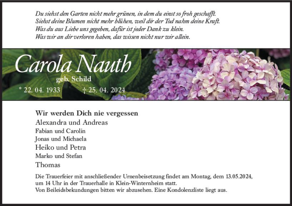 Hier finden Sie alle Traueranzeigen aus der Zeitung, die bisher für Carola Nauth erschienen sind. Weitere Traueranzeigen, die in der Zeitung erscheinen, werden hier ebenfalls aufgelistet