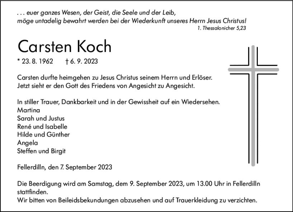 Hier finden Sie alle Traueranzeigen aus der Zeitung, die bisher für Carsten Koch erschienen sind. Weitere Traueranzeigen, die in der Zeitung erscheinen, werden hier ebenfalls aufgelistet