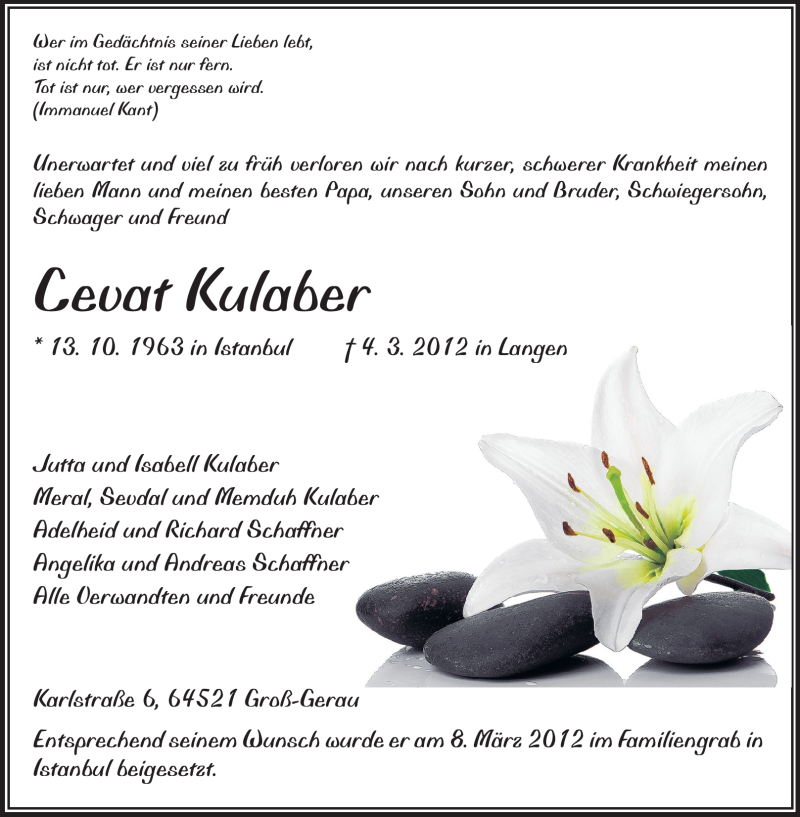 Hier finden Sie alle Traueranzeigen aus der Zeitung, die bisher für Cevat Kulaber erschienen sind. Weitere Traueranzeigen, die in der Zeitung erscheinen, werden hier ebenfalls aufgelistet