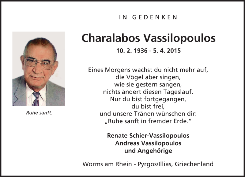 Hier finden Sie alle Traueranzeigen aus der Zeitung, die bisher für Charalabos Vassilopoulos erschienen sind. Weitere Traueranzeigen, die in der Zeitung erscheinen, werden hier ebenfalls aufgelistet