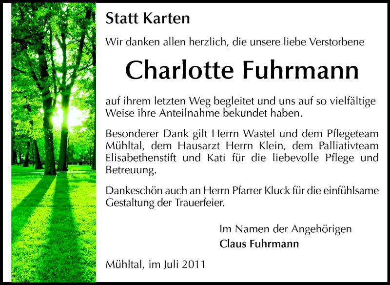 Hier finden Sie alle Traueranzeigen aus der Zeitung, die bisher für Charlotte Fuhrmann erschienen sind. Weitere Traueranzeigen, die in der Zeitung erscheinen, werden hier ebenfalls aufgelistet