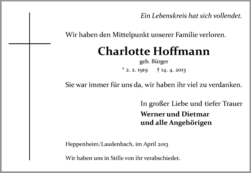 Hier finden Sie alle Traueranzeigen aus der Zeitung, die bisher für Charlotte Hoffmann erschienen sind. Weitere Traueranzeigen, die in der Zeitung erscheinen, werden hier ebenfalls aufgelistet