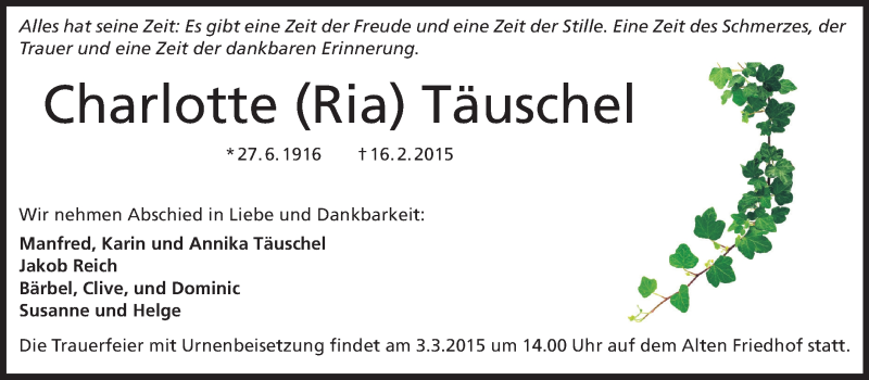 Hier finden Sie alle Traueranzeigen aus der Zeitung, die bisher für Charlotte Täuschel erschienen sind. Weitere Traueranzeigen, die in der Zeitung erscheinen, werden hier ebenfalls aufgelistet