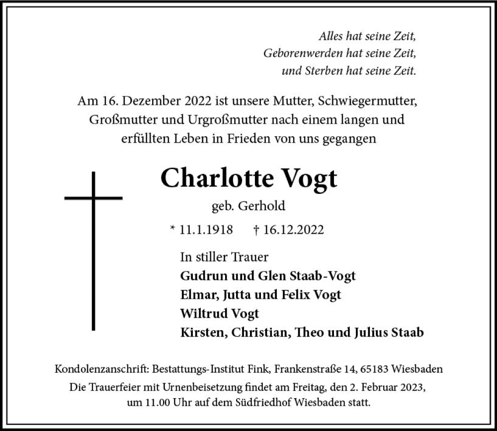 Hier finden Sie alle Traueranzeigen aus der Zeitung, die bisher für Charlotte Vogt erschienen sind. Weitere Traueranzeigen, die in der Zeitung erscheinen, werden hier ebenfalls aufgelistet