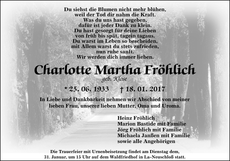 Hier finden Sie alle Traueranzeigen aus der Zeitung, die bisher für Charlotte Martha Fröhlich erschienen sind. Weitere Traueranzeigen, die in der Zeitung erscheinen, werden hier ebenfalls aufgelistet