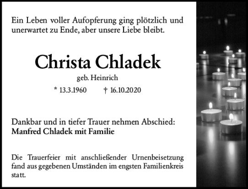 Hier finden Sie alle Traueranzeigen aus der Zeitung, die bisher für Christa Chladek erschienen sind. Weitere Traueranzeigen, die in der Zeitung erscheinen, werden hier ebenfalls aufgelistet