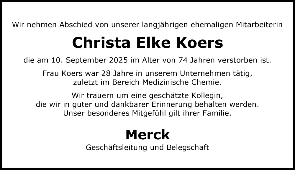 Hier finden Sie alle Traueranzeigen aus der Zeitung, die bisher für Christa Elke Koers erschienen sind. Weitere Traueranzeigen, die in der Zeitung erscheinen, werden hier ebenfalls aufgelistet