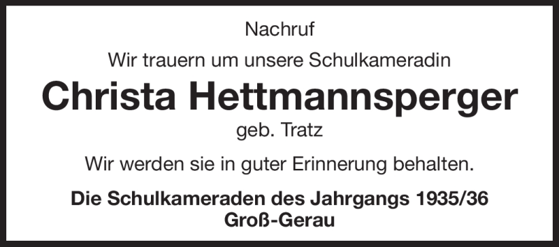 Hier finden Sie alle Traueranzeigen aus der Zeitung, die bisher für Christa Hettmannsperger erschienen sind. Weitere Traueranzeigen, die in der Zeitung erscheinen, werden hier ebenfalls aufgelistet