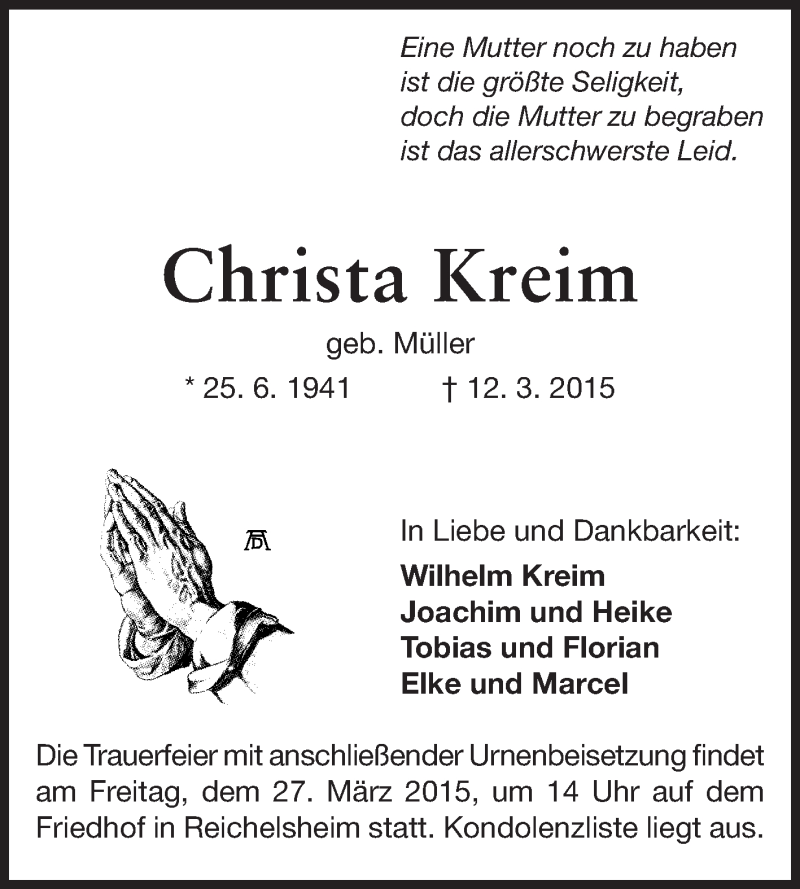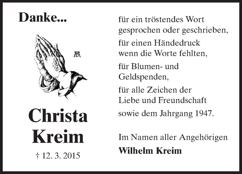 Hier finden Sie alle Traueranzeigen aus der Zeitung, die bisher für Christa Kreim erschienen sind. Weitere Traueranzeigen, die in der Zeitung erscheinen, werden hier ebenfalls aufgelistet