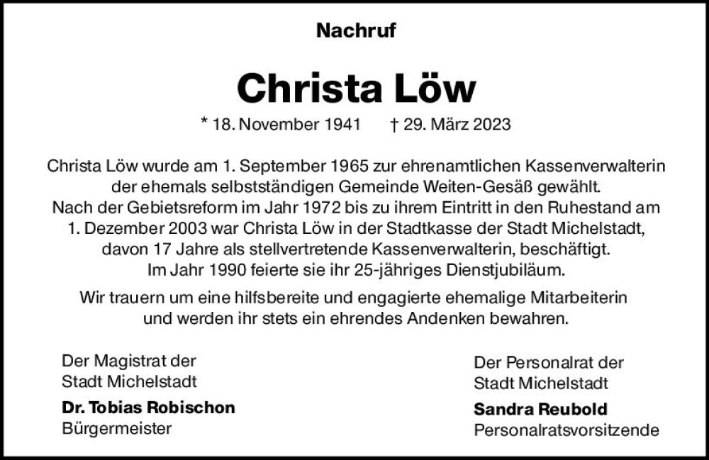 Hier finden Sie alle Traueranzeigen aus der Zeitung, die bisher für Christa Löw erschienen sind. Weitere Traueranzeigen, die in der Zeitung erscheinen, werden hier ebenfalls aufgelistet