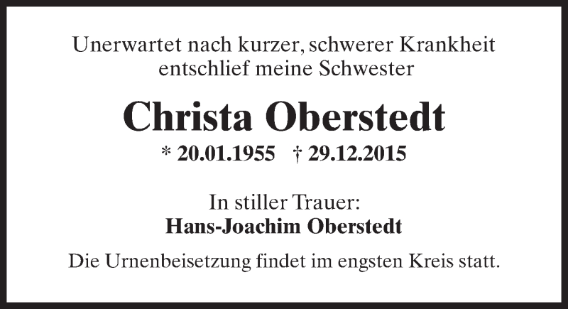 Hier finden Sie alle Traueranzeigen aus der Zeitung, die bisher für Christa Oberstedt erschienen sind. Weitere Traueranzeigen, die in der Zeitung erscheinen, werden hier ebenfalls aufgelistet