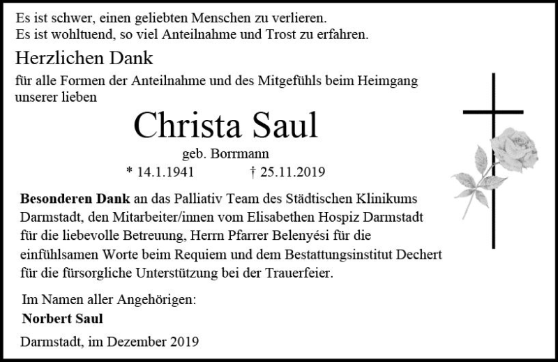 Hier finden Sie alle Traueranzeigen aus der Zeitung, die bisher für Christa Saul erschienen sind. Weitere Traueranzeigen, die in der Zeitung erscheinen, werden hier ebenfalls aufgelistet