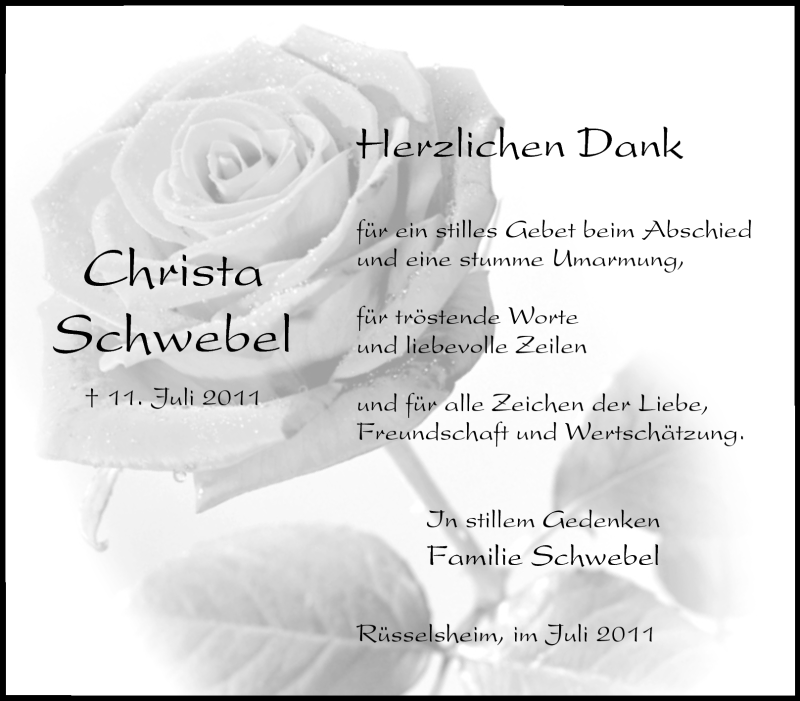 Hier finden Sie alle Traueranzeigen aus der Zeitung, die bisher für Christa Schwebel erschienen sind. Weitere Traueranzeigen, die in der Zeitung erscheinen, werden hier ebenfalls aufgelistet