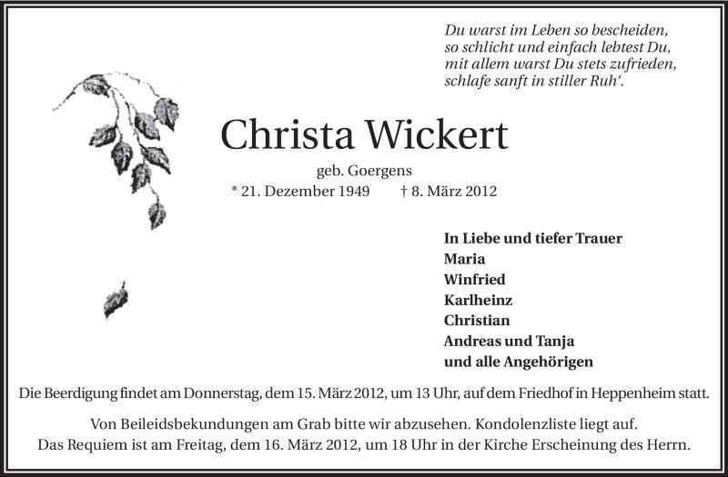 Hier finden Sie alle Traueranzeigen aus der Zeitung, die bisher für Christa Wickert erschienen sind. Weitere Traueranzeigen, die in der Zeitung erscheinen, werden hier ebenfalls aufgelistet