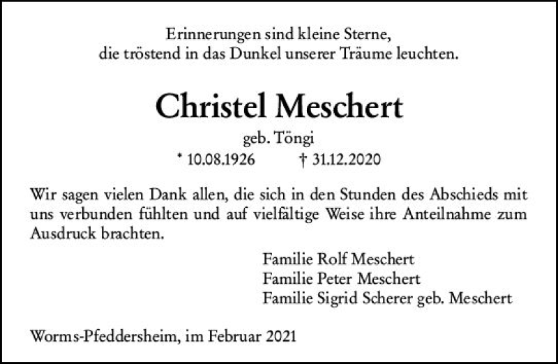 Hier finden Sie alle Traueranzeigen aus der Zeitung, die bisher für Christel Meschert erschienen sind. Weitere Traueranzeigen, die in der Zeitung erscheinen, werden hier ebenfalls aufgelistet