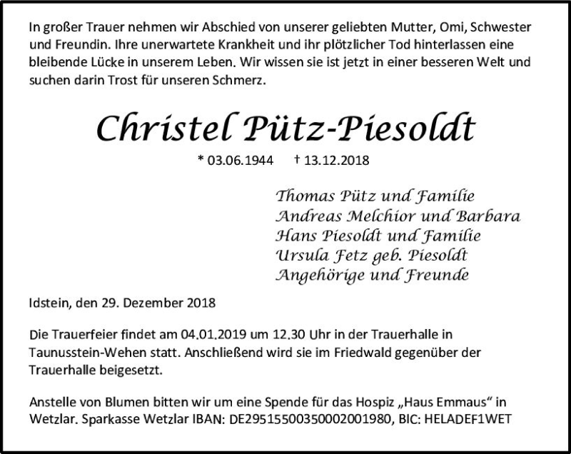 Hier finden Sie alle Traueranzeigen aus der Zeitung, die bisher für Christel Pütz-Piesoldt erschienen sind. Weitere Traueranzeigen, die in der Zeitung erscheinen, werden hier ebenfalls aufgelistet