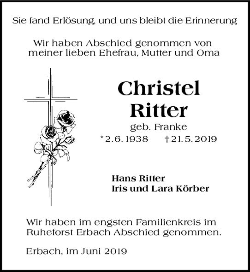 Hier finden Sie alle Traueranzeigen aus der Zeitung, die bisher für Christel Ritter erschienen sind. Weitere Traueranzeigen, die in der Zeitung erscheinen, werden hier ebenfalls aufgelistet