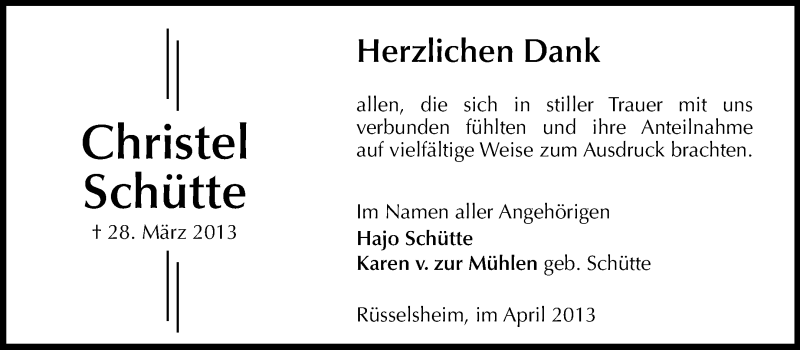Hier finden Sie alle Traueranzeigen aus der Zeitung, die bisher für Christel Schütte erschienen sind. Weitere Traueranzeigen, die in der Zeitung erscheinen, werden hier ebenfalls aufgelistet