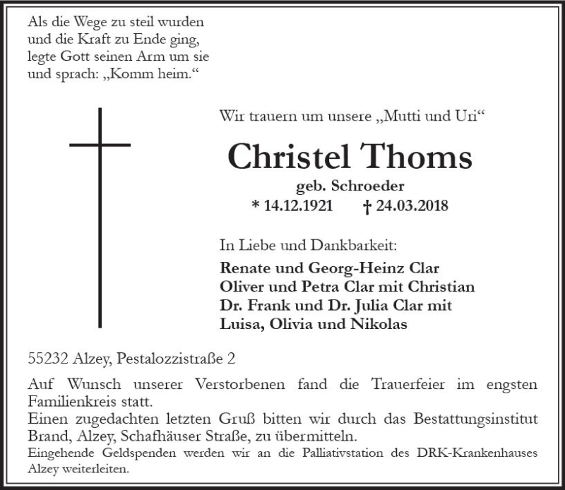 Hier finden Sie alle Traueranzeigen aus der Zeitung, die bisher für Christel Thoms erschienen sind. Weitere Traueranzeigen, die in der Zeitung erscheinen, werden hier ebenfalls aufgelistet