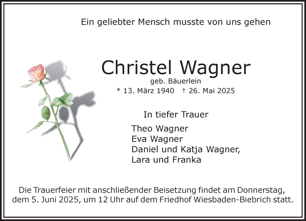 Hier finden Sie alle Traueranzeigen aus der Zeitung, die bisher für Christel Wagner erschienen sind. Weitere Traueranzeigen, die in der Zeitung erscheinen, werden hier ebenfalls aufgelistet