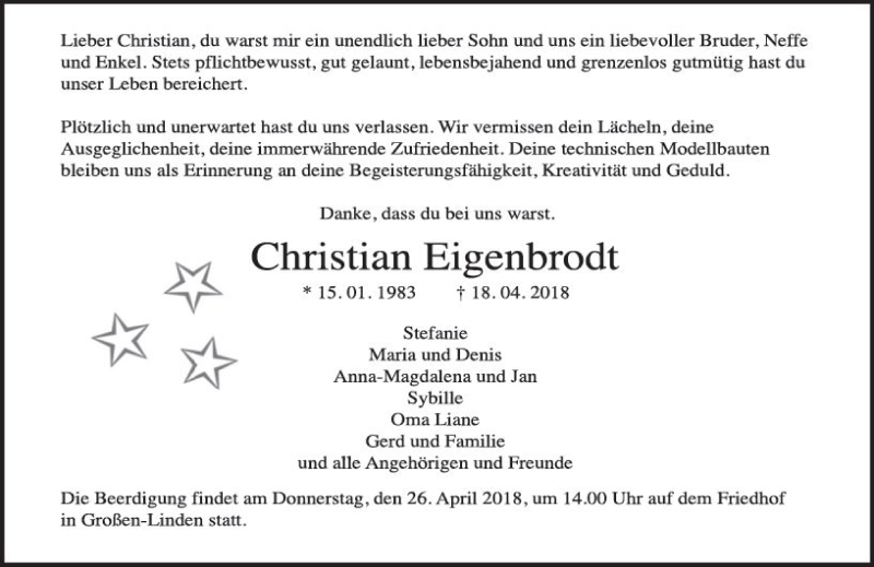 Hier finden Sie alle Traueranzeigen aus der Zeitung, die bisher für Christian Eigenbrodt erschienen sind. Weitere Traueranzeigen, die in der Zeitung erscheinen, werden hier ebenfalls aufgelistet