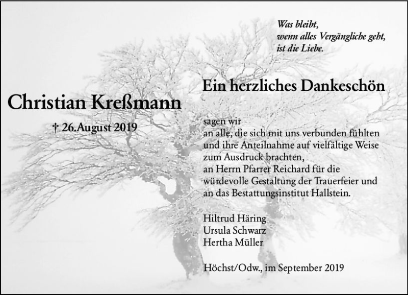 Hier finden Sie alle Traueranzeigen aus der Zeitung, die bisher für Christian Kreßmann erschienen sind. Weitere Traueranzeigen, die in der Zeitung erscheinen, werden hier ebenfalls aufgelistet