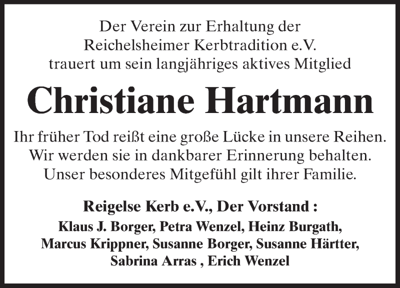Hier finden Sie alle Traueranzeigen aus der Zeitung, die bisher für Christiane Hartmann erschienen sind. Weitere Traueranzeigen, die in der Zeitung erscheinen, werden hier ebenfalls aufgelistet