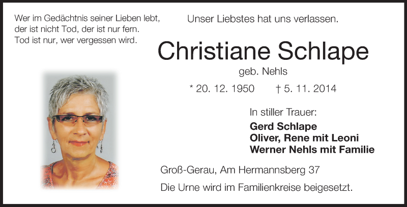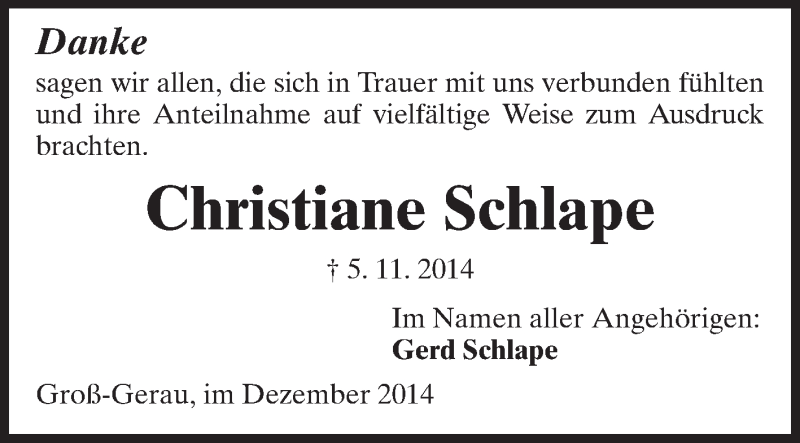 Hier finden Sie alle Traueranzeigen aus der Zeitung, die bisher für Christiane Schlape erschienen sind. Weitere Traueranzeigen, die in der Zeitung erscheinen, werden hier ebenfalls aufgelistet