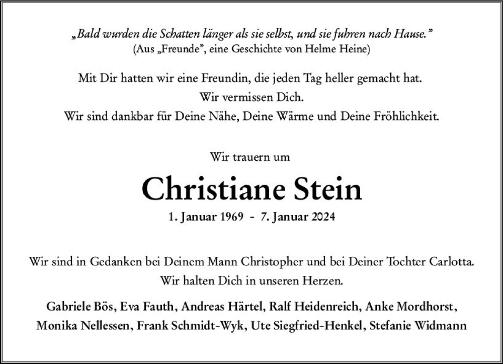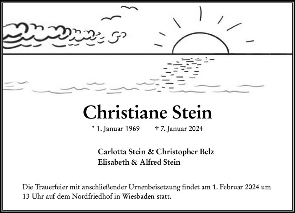 Hier finden Sie alle Traueranzeigen aus der Zeitung, die bisher für Christiane Stein erschienen sind. Weitere Traueranzeigen, die in der Zeitung erscheinen, werden hier ebenfalls aufgelistet