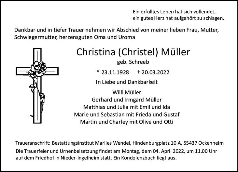 Hier finden Sie alle Traueranzeigen aus der Zeitung, die bisher für Christina Müller erschienen sind. Weitere Traueranzeigen, die in der Zeitung erscheinen, werden hier ebenfalls aufgelistet