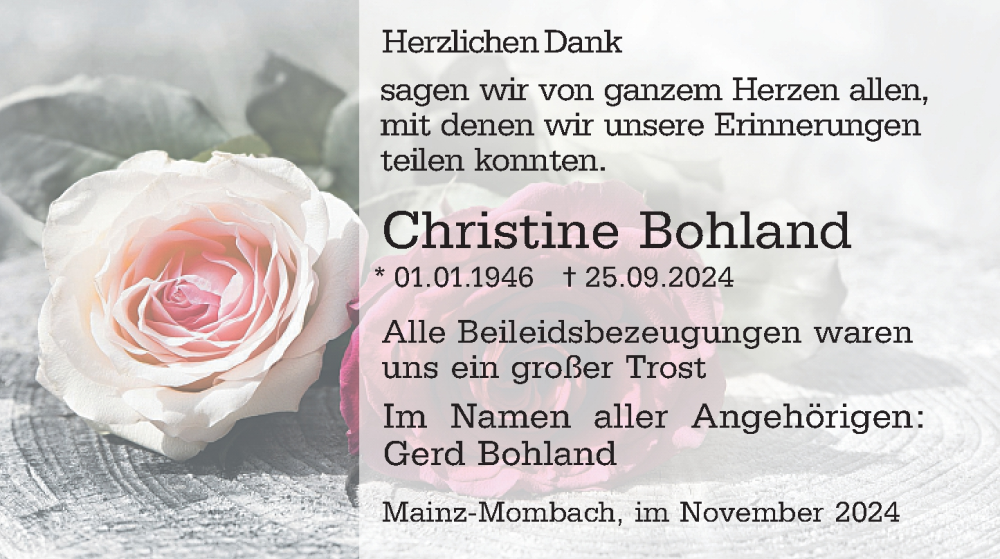 Hier finden Sie alle Traueranzeigen aus der Zeitung, die bisher für Christine Bohland erschienen sind. Weitere Traueranzeigen, die in der Zeitung erscheinen, werden hier ebenfalls aufgelistet