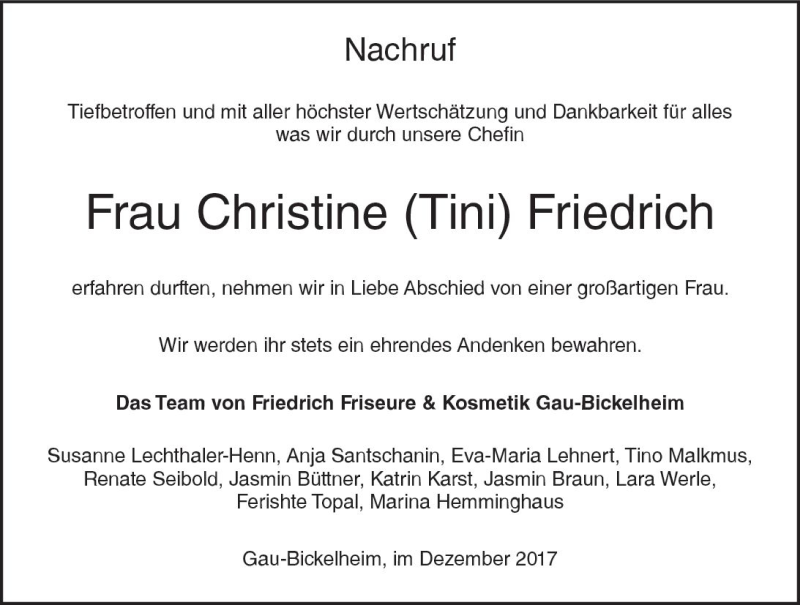 Hier finden Sie alle Traueranzeigen aus der Zeitung, die bisher für Christine Friedrich erschienen sind. Weitere Traueranzeigen, die in der Zeitung erscheinen, werden hier ebenfalls aufgelistet