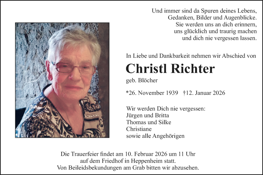 Hier finden Sie alle Traueranzeigen aus der Zeitung, die bisher für Christl Richter erschienen sind. Weitere Traueranzeigen, die in der Zeitung erscheinen, werden hier ebenfalls aufgelistet