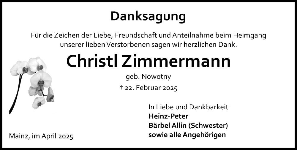 Hier finden Sie alle Traueranzeigen aus der Zeitung, die bisher für Christl Zimmermann erschienen sind. Weitere Traueranzeigen, die in der Zeitung erscheinen, werden hier ebenfalls aufgelistet