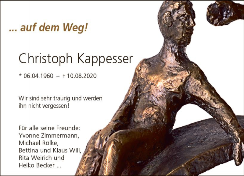 Hier finden Sie alle Traueranzeigen aus der Zeitung, die bisher für Christoph Kappesser erschienen sind. Weitere Traueranzeigen, die in der Zeitung erscheinen, werden hier ebenfalls aufgelistet
