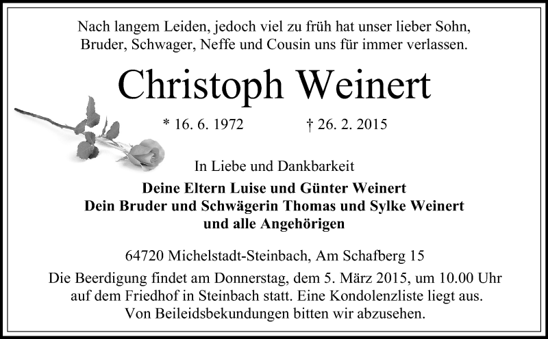 Hier finden Sie alle Traueranzeigen aus der Zeitung, die bisher für Christoph Weinert erschienen sind. Weitere Traueranzeigen, die in der Zeitung erscheinen, werden hier ebenfalls aufgelistet