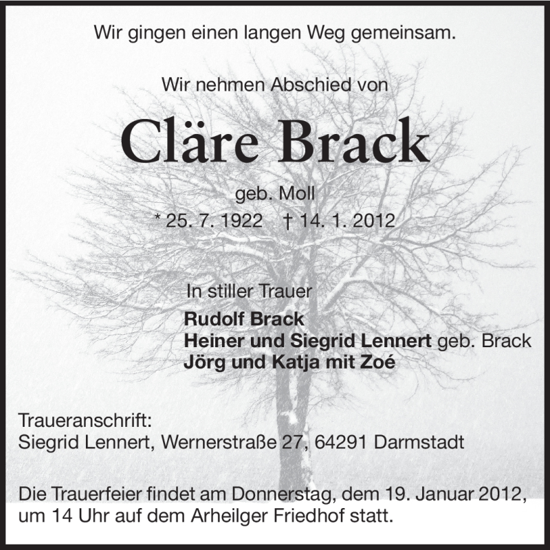 Hier finden Sie alle Traueranzeigen aus der Zeitung, die bisher für Cläre Brack erschienen sind. Weitere Traueranzeigen, die in der Zeitung erscheinen, werden hier ebenfalls aufgelistet