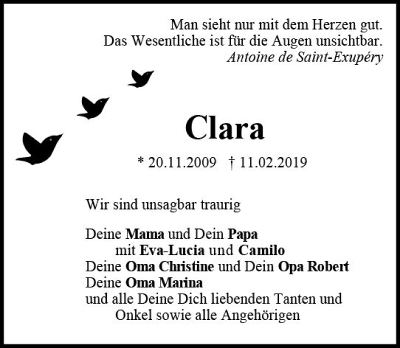 Hier finden Sie alle Traueranzeigen aus der Zeitung, die bisher für Clara erschienen sind. Weitere Traueranzeigen, die in der Zeitung erscheinen, werden hier ebenfalls aufgelistet