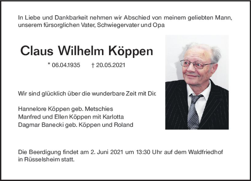 Hier finden Sie alle Traueranzeigen aus der Zeitung, die bisher für Claus Wilhelm Köppen erschienen sind. Weitere Traueranzeigen, die in der Zeitung erscheinen, werden hier ebenfalls aufgelistet