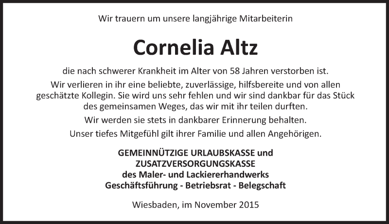 Hier finden Sie alle Traueranzeigen aus der Zeitung, die bisher für Cornelia Altz erschienen sind. Weitere Traueranzeigen, die in der Zeitung erscheinen, werden hier ebenfalls aufgelistet