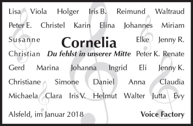 Hier finden Sie alle Traueranzeigen aus der Zeitung, die bisher für Cornelia Schornstein erschienen sind. Weitere Traueranzeigen, die in der Zeitung erscheinen, werden hier ebenfalls aufgelistet