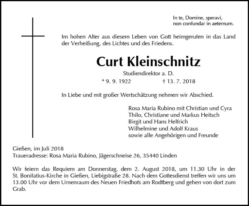 Hier finden Sie alle Traueranzeigen aus der Zeitung, die bisher für Curt Kleinschnitz erschienen sind. Weitere Traueranzeigen, die in der Zeitung erscheinen, werden hier ebenfalls aufgelistet