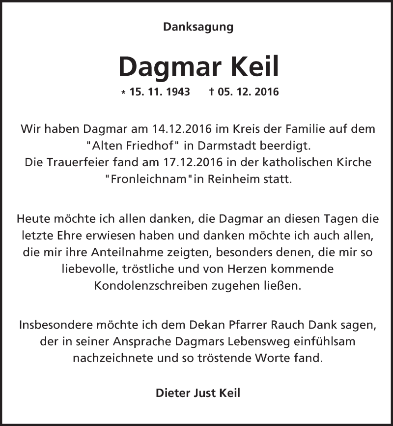 Hier finden Sie alle Traueranzeigen aus der Zeitung, die bisher für Dagmar Keil erschienen sind. Weitere Traueranzeigen, die in der Zeitung erscheinen, werden hier ebenfalls aufgelistet