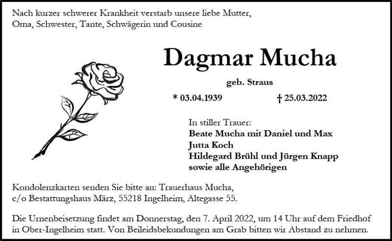 Hier finden Sie alle Traueranzeigen aus der Zeitung, die bisher für Dagmar Mucha erschienen sind. Weitere Traueranzeigen, die in der Zeitung erscheinen, werden hier ebenfalls aufgelistet
