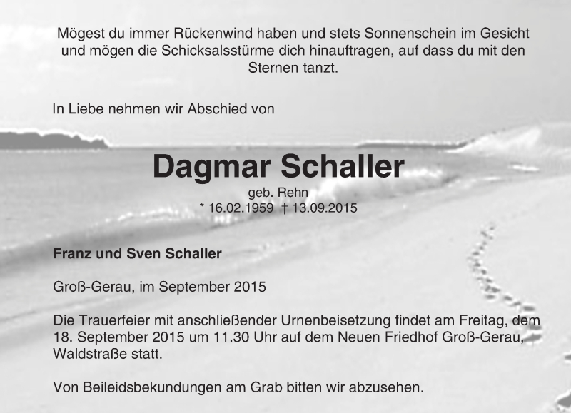 Hier finden Sie alle Traueranzeigen aus der Zeitung, die bisher für Dagmar Schalter erschienen sind. Weitere Traueranzeigen, die in der Zeitung erscheinen, werden hier ebenfalls aufgelistet