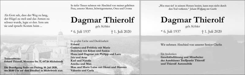 Hier finden Sie alle Traueranzeigen aus der Zeitung, die bisher für Dagmar Thierolf erschienen sind. Weitere Traueranzeigen, die in der Zeitung erscheinen, werden hier ebenfalls aufgelistet