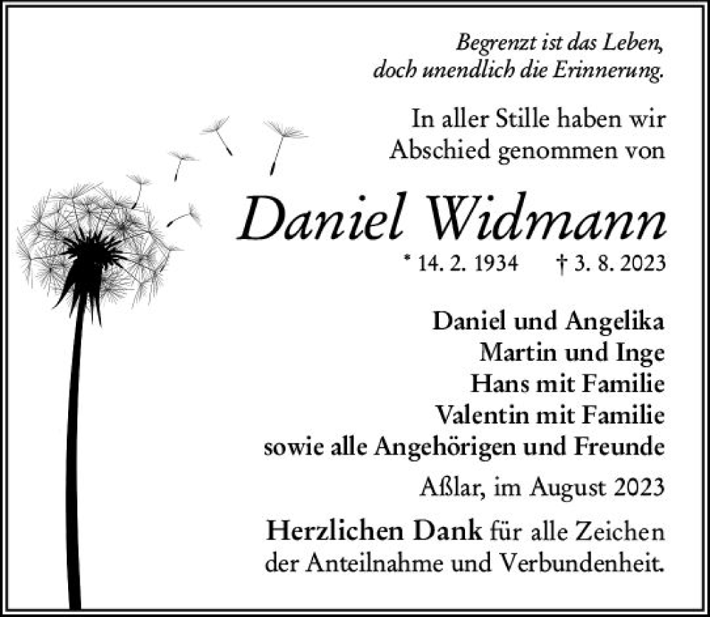 Hier finden Sie alle Traueranzeigen aus der Zeitung, die bisher für Daniel Widmann erschienen sind. Weitere Traueranzeigen, die in der Zeitung erscheinen, werden hier ebenfalls aufgelistet
