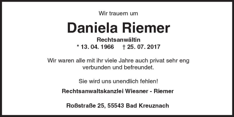 Hier finden Sie alle Traueranzeigen aus der Zeitung, die bisher für Daniela Riemer erschienen sind. Weitere Traueranzeigen, die in der Zeitung erscheinen, werden hier ebenfalls aufgelistet